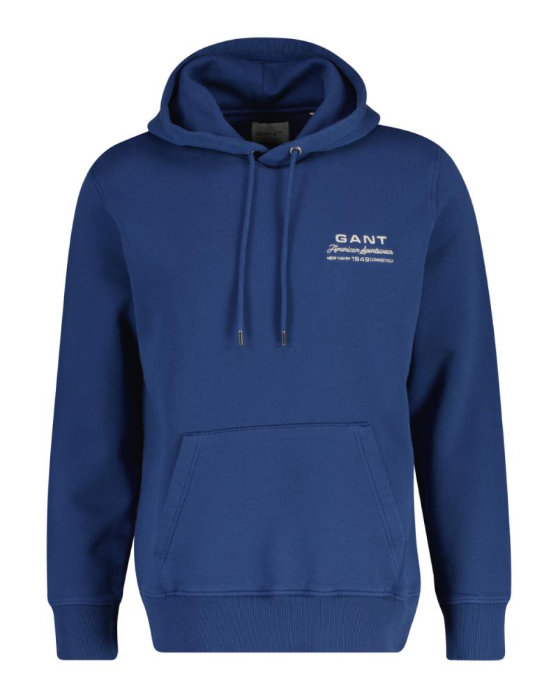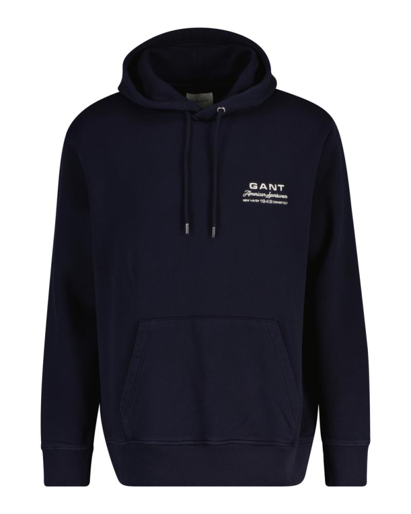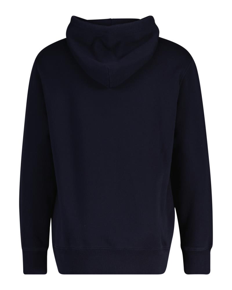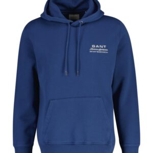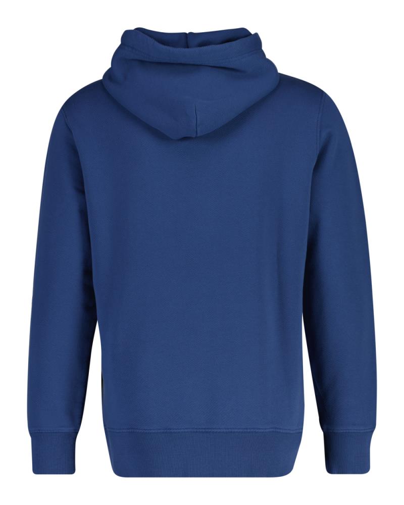 DESCRIÇÃO: Moletom com capuz – Estampa bordada no lado esquerdo do peito – Bolso canguru – Fita de reforço na gola – Barra e punhos canelados – Cordão redondo – Ilhós com a marca Gant e ponteiras planas no cordão – Protetor de gola em tecido resistente. COMPOSIÇÃO: 100% algodão